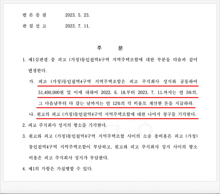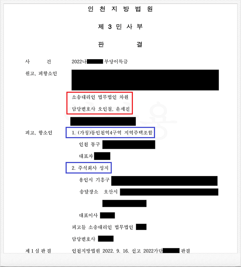그러나 이와 같은 법원의 판결에도 피고 (가칭)동인천역4구역 지역주택조합 측은 패소를 인정하지 못하고, 항소하였습니다.