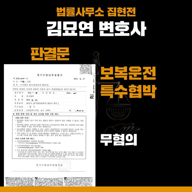 그 결과 경찰에서는 본 변호인의 주장을 모두 받아들였고, 당시 의뢰인이 연루된 보복운전, 특수협박 혐의에 대해 증거불충분, 즉 ‘무혐의’로 사건을 종결하며, 다행히도 좋은 결과로 사안을 마무리 지을 수 있었습니다.