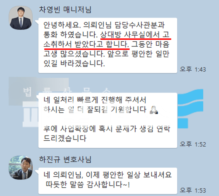 이에 변호인은 합의 진행 혹은 수사 진행의 두 가지 방안을 안내하였고 의뢰인은 시간 및 비용 측면을 고려해 합의 진행을 희망하였습니다.