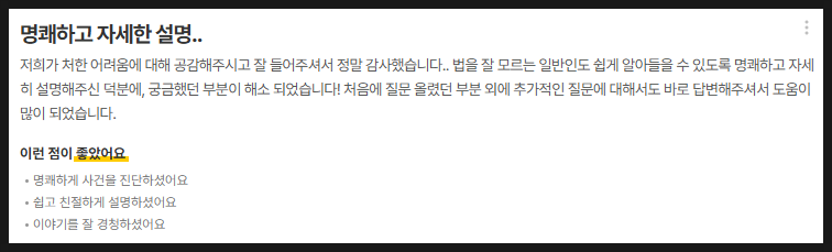 그런 의미에서, 제 로톡 후기 하나를 퍼와보겠습니다. 작성자의 동의를 받지는 않았는데, 이 정도라면 제가 스스로를 방어할 수 있을 것 같습니다.