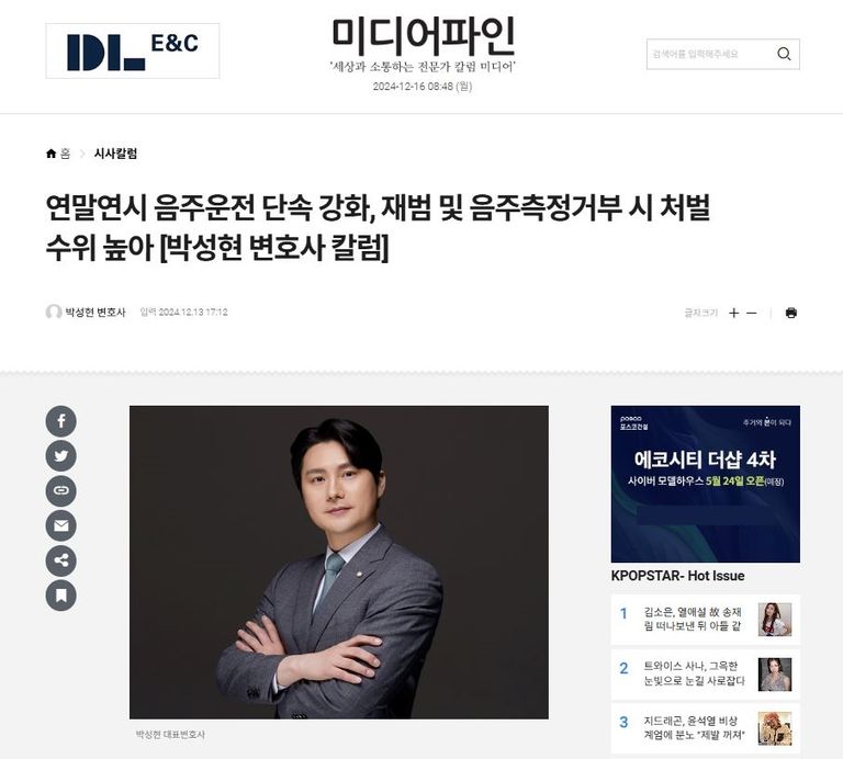 음주운전은 자신뿐만 아니라 타인의 삶을 위협하는 행위이다. 단속 강화와 함께 개인의 자발적인 예방 노력이 필요한 시점이다.(법률사무소 유의 박성현 대표변호사)