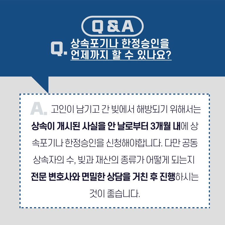 상속포기나 한정승인 절차는 상속이 개시된 사실을 안 날로부터 3개월 내에 신청해야만 합니다.