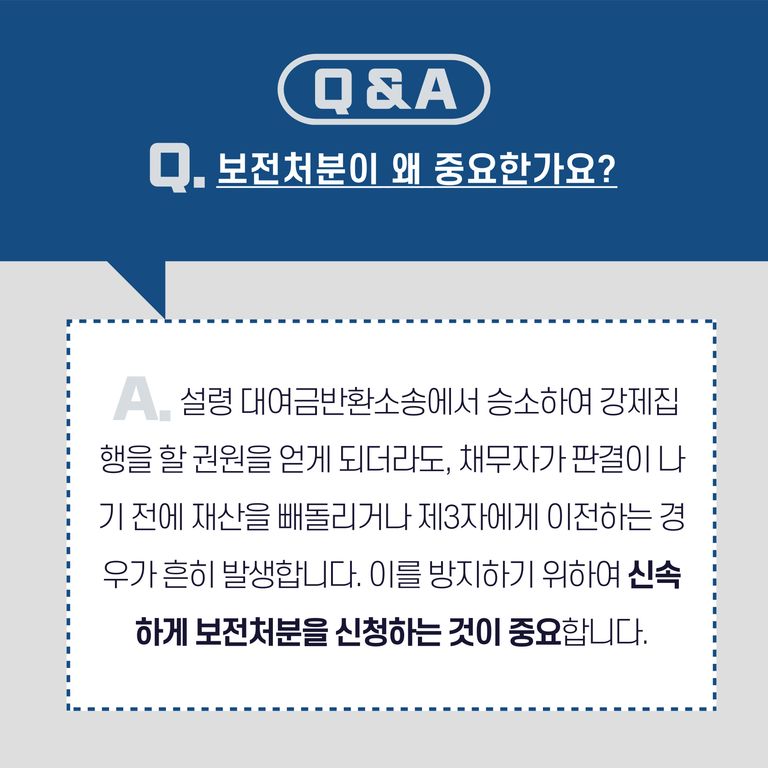 따라서 이러한 상황을 방지하기 위하여 가압류, 가처분 등의 절차를 이용하여 채무자의 재산을 미리 동결시키는 것이 매우 중요합니다.