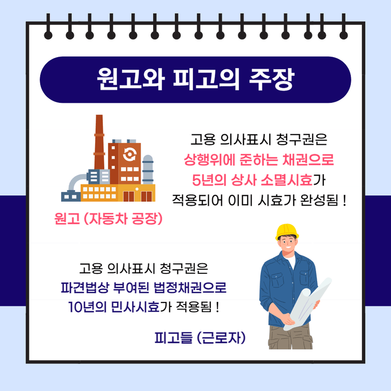 원고들은 피고를 상대로 근로자지위확인 및 고용의사표시를 청구했는데 피고는 원고들의 고용 의사표시 청구권은 상행위에 준하는 채권으로 5년의 상사 소멸시효가 적용되어 시효가 완성되었다고 주장했습니다.