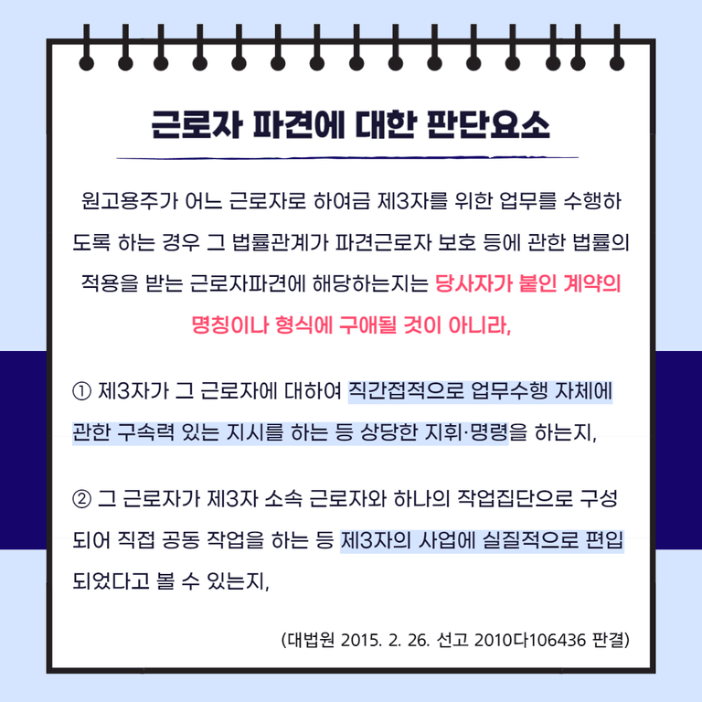 원고용주가 어느 근로자로 하여금 제3자를 위한 업무를 수행하도록 하는 경우 그 법률관계가 파견근로자 보호 등에 관한 법률의 적용을 받는 근로자파견에 해당하는지는 당사자가 붙인 계약의 명칭이나 형식에 구애될 것이 아니라, ① 제3자가 그 근로자에 대하여 직간접적으로 업무수행 자체에 관한 구속력 있는 지시를 하는 등 상당한 지휘·명령을 하는지, ② 그 근로자가 제3자 소속 근로자와 하나의 작업집단으로 구성되어 직접 공동 작업을 하는 등 제3자의 사업에 실질적으로 편입되었다고 볼 수 있는지,