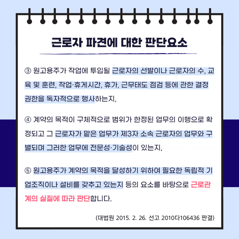 ③ 원고용주가 작업에 투입될 근로자의 선발이나 근로자의 수, 교육 및 훈련, 작업·휴게시간, 휴가, 근무태도 점검 등에 관한 결정 권한을 독자적으로 행사하는지, ④ 계약의 목적이 구체적으로 범위가 한정된 업무의 이행으로 확정되고 그 근로자가 맡은 업무가 제3자 소속 근로자의 업무와 구별되며 그러한 업무에 전문성·기술성이 있는지, ⑤ 원고용주가 계약의 목적을 달성하기 위하여 필요한 독립적 기업조직이나 설비를 갖추고 있는지 등의 요소를 바탕으로 근로관계의 실질에 따라 판단합니다. (대법원 2015. 2. 26. 선고 2010다106436 판결)