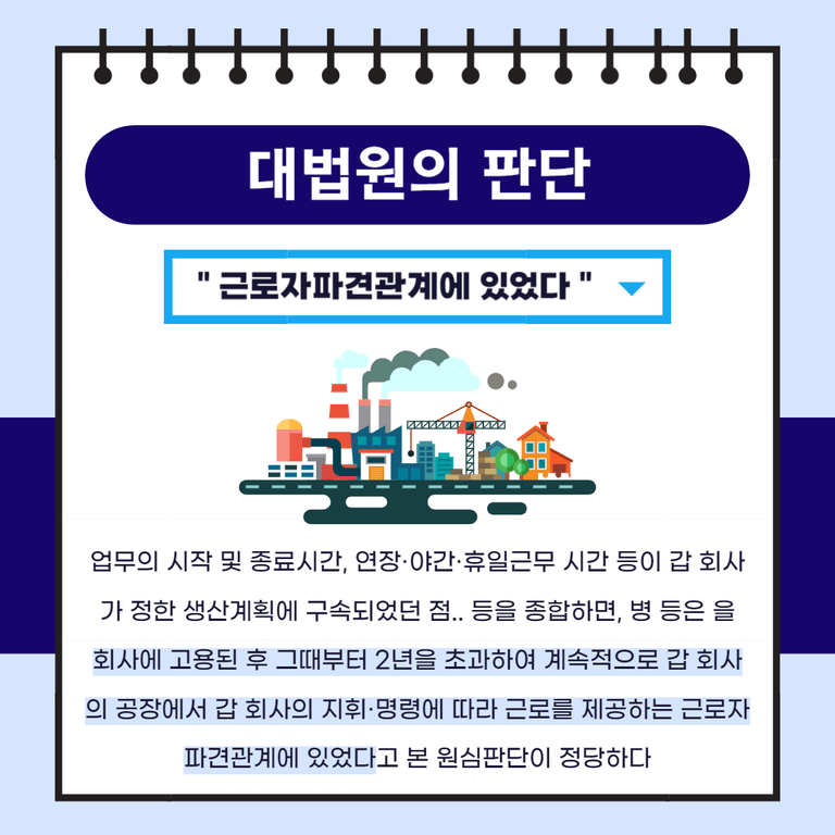 오늘은, 파견근로자 판단여부와 고용의사표시 청구권의 소멸시효에 관한 판례를 소개해드리겠습니다. 대법원 2024. 7. 11. 선고 2021다274069 판결