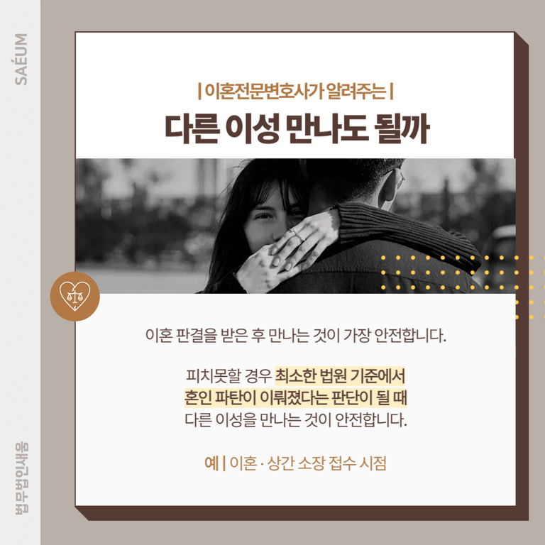 그렇다면 정확히 언제부터 나 역시 다른 이성을 만나 교제하는 것이 가능할까요? 예컨대 남편이 먼저 바람을 피워서 관계가 망가져 그 이후에 나 역시 다른 사람을 만나고 싶다면, 이혼소송을 진행하기 전에 가능할까요?