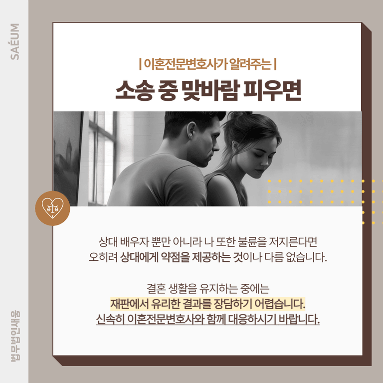 나 또한 불륜을 저지른다면 오히려 상대에게 약점을 제공하는 것이나 다름없습니다. 먼저 외도를 하였으니, 책임을 져야 한다고 주장하더라도 결혼생활을 유지하는 중인 이상 재판에서 유리한 결과를 장담하기가 어렵습니다.