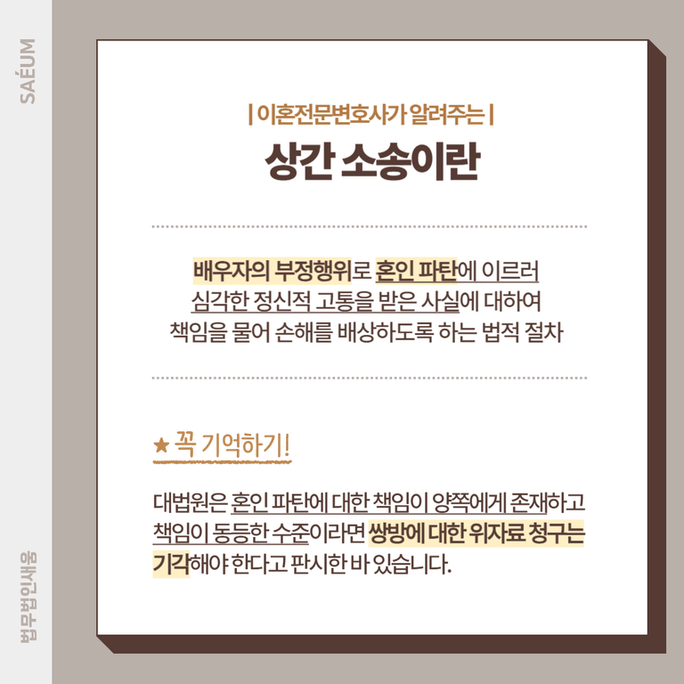 상간소송은 배우자의 부정행위로 인하여 혼인이 파탄에 이르러 심각한 정신적 고통과 충격을 받은 사실에 대하여 상대에게 책임을 물어 손해를 배상하도록 하는 법적 절차입니다.
