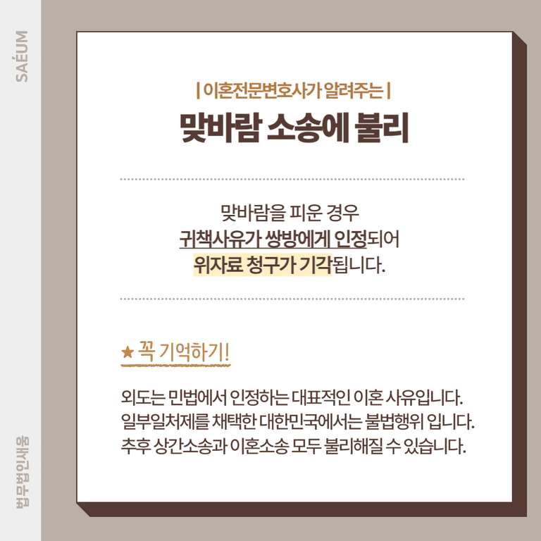 많은 이혼 사건을 다루다 보면 의외로 맞바람이 문제가 되는 경우가 많습니다. 처음에는 상대 배우자가 불륜을 저질러 분노하고 슬퍼하다가 복수심에 의해 자신도 똑같은 일을 저지르는 경우가 생기고는 합니다.