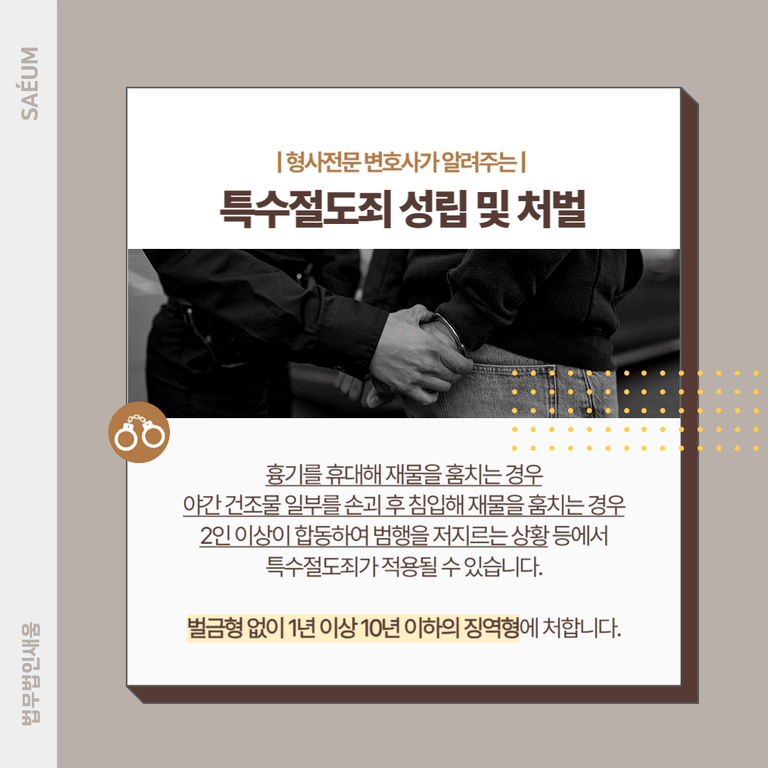특수절도는 여러 상황에 적용이 됩니다. 우선 흉기를 휴대하여 재물을 훔치는 경우 혹은 야간에 담이나 문 등 건조물의 일부를 손괴한 후 침입하여 재물 절취를 하는 경우 그리고 2인 이상이 합동하여 범행을 저지르는 상황에서 적용이 됩니다. 이와 같은 범행을 저지르게 될 경우 6년 이하 혹은 천만 원 이하의 처벌이 내려오는 절도죄와 다르게 벌금형 없이 1~10년의 징역형이 내려오게 됩니다.