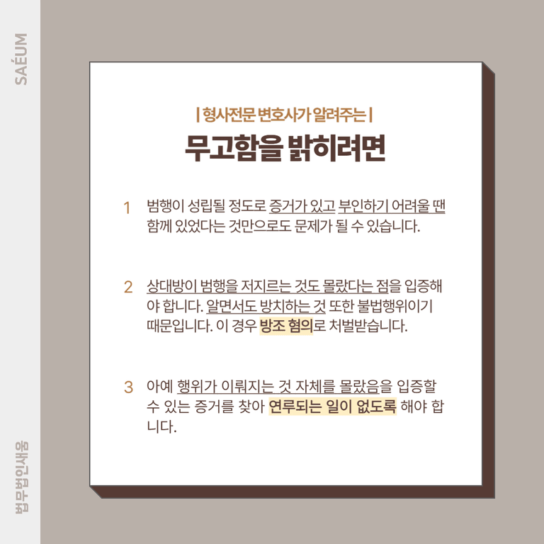 범행이 성립될 정도의 증거가 있고 부인을 하기 어려운 상황이라면 자칫 함께 있었다는 것만으로도 문제가 될 수 있으므로 빠르게 대응에 나서야 합니다. 같이 혐의가 적용되는 것을 막기 위해서는 상대방이 범행을 저지르는 것도 몰랐다는 점을 입증하는 것이 좋은데요. 알면서도 방치하는 것 또한 불법적인 행위이기 때문에 본인이 직접 가담한 바가 없다고 해도 방조 혐의로 처벌을 받게 될 수 있습니다.