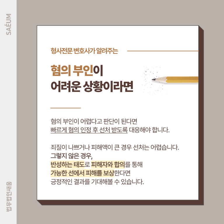 혐의를 부인하는 것이 가능한 상황이라면 크게 문제가 되지는 않겠지만 명백한 증거가 있어 부인하는 것이 힘들다면 무리해서 부인해서는 안 됩니다. 무리하게 혐의를 부인하는 경우 잘못을 인정하지 않는 것으로 보일 수 있기 때문입니다.