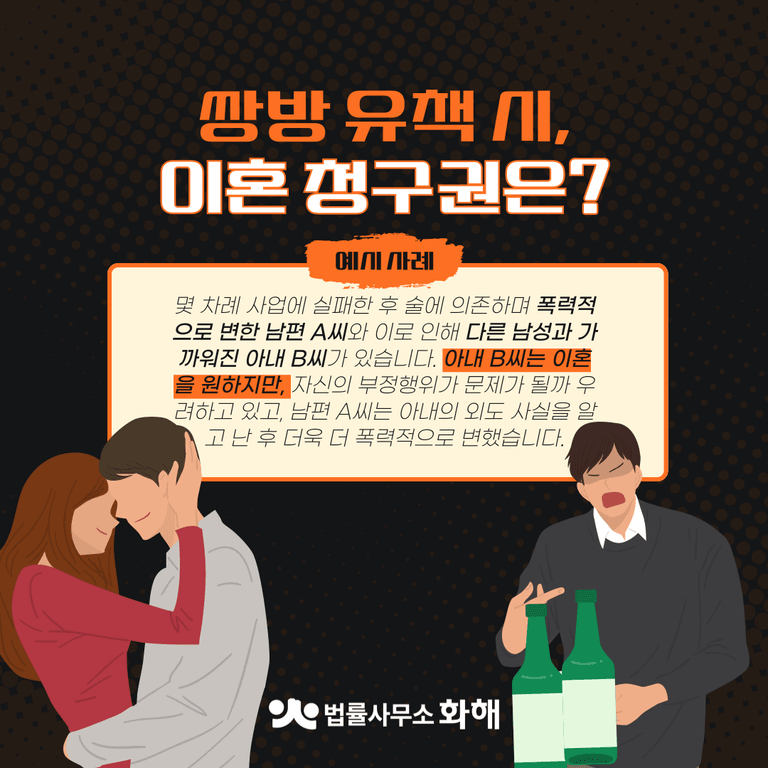 사례 - 몇 차례 사업에 실패한 후 술에 의존하며 폭력적으로 변한 남편 A씨와 이로 인해 다른 남성과 가까워진 아내 B씨가 있습니다. 아내 B씨는 이혼을 원하지만, 자신의 부정행위가 문제가 될까 우려하고 있고, 남편 A씨는 아내의 외도 사실을 알고 난 후 더욱더 폭력적으로 변했습니다.