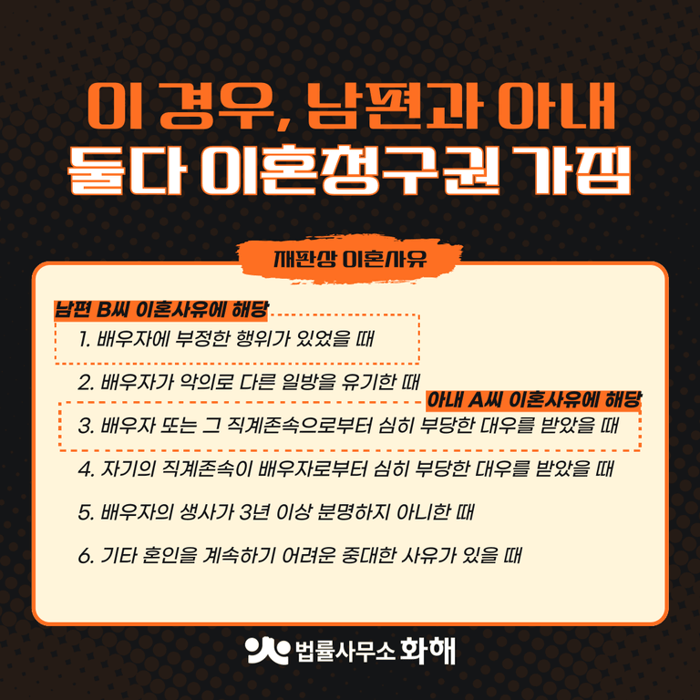 앞서 설명드렸듯이 잘못이 있는 사람 즉, 유책 사유가 있는 사람은 이혼을 청구할 수 없습니다. 그렇다면 이 사례처럼 둘 다에게 잘못이 있을 때, 서로 이혼을 청구 할 수 있을까요?