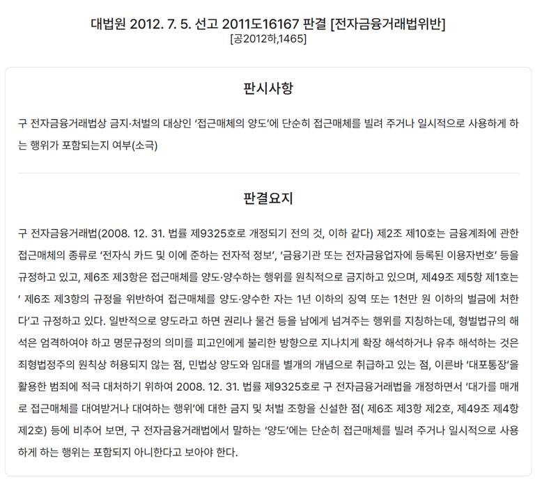 대법원 2012. 7. 5. 선고 2011도16167 판결 등에 따르면, ‘접근매체의 양도’에는 단순히 접근매체를 빌려주거나 일시적으로 사용하게 하는 행위가 포함되지 않습니다.