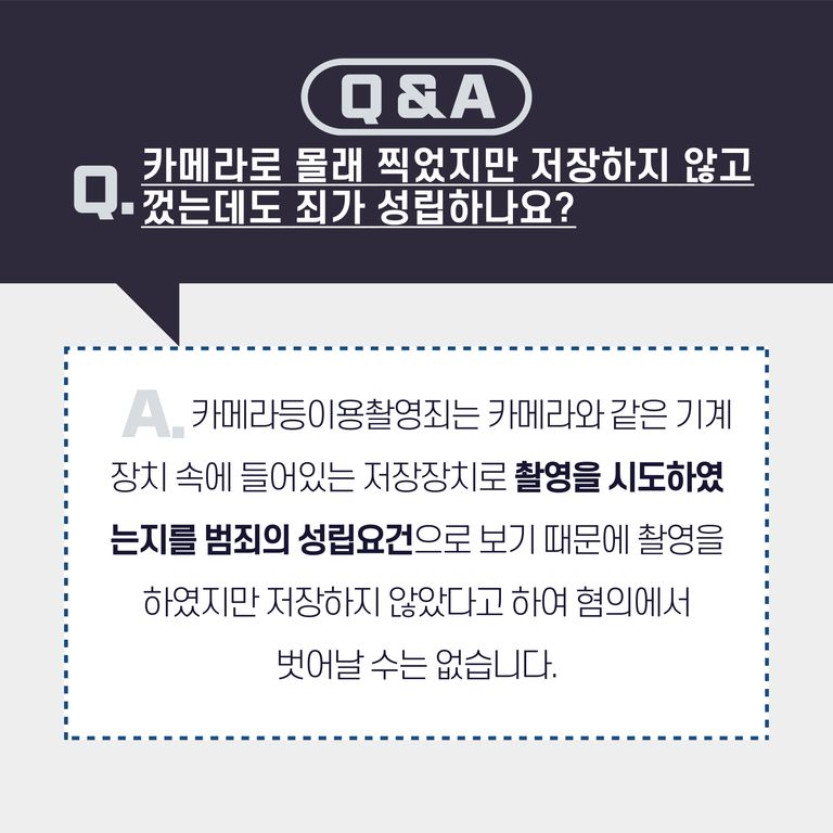 이런 분위기 속에서 저희 사무실에 카촬죄에 대해 많이들 질문하시는 부분이 바로 불법촬영물을 저장하지 않았는데도 죄가 성립하는지 여부입니다.