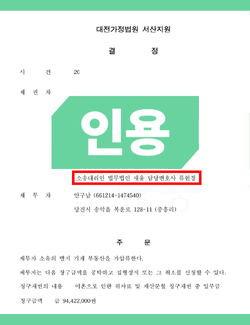 이에 법무법인 새움에서는 상대방 소유의 부동산에 대해서 재산분할 및 위자료청구권 채권을 사유로 하여 11월 21일 신청하여 11월 27일 보증보험 전액으로 담보제공명령을 받았으며 12월 4일 최종적인 결정문을 송달받을 수 있었습니다.