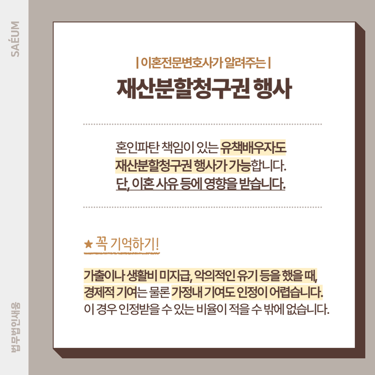 위자료쳥구권의 경우 당연히 유책배우자가 행사할 수 없는 권한입니다. 하지만 재산분할청구권의 경우 설령 유책배우자의 입장이라고 해도 얼마든지 청구할 수 있는데요. 피해보상이 아니라 어디까지나 지금껏 공동으로 소유해 온 재산에 대해서 기여한 바에 따라 나눠 갖는 것뿐이기 때문에 청구할 수 있습니다.