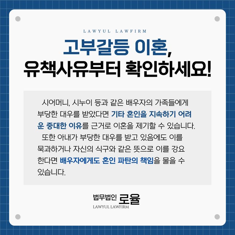 이러한 고부갈등은 민법에 규정해놓은 6가지의 이혼 사유 중 ‘배우자와 그 직계존속에게 심히 부당한 대우를 받은 때’에 해당하여 이혼에 관한 협의가 이루어지지 않더라도 소송으로 이혼 판결을 얻어낼 수 있습니다.