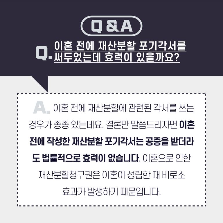 재산분할청구권은 이혼이 성립한 때 비로소 효과가 발생하기 때문에, 혼인이 해소되기도 전에 구체화되지도 않은 재산분할청구권을 미리 포기하는 것은 허용되지 않습니다.