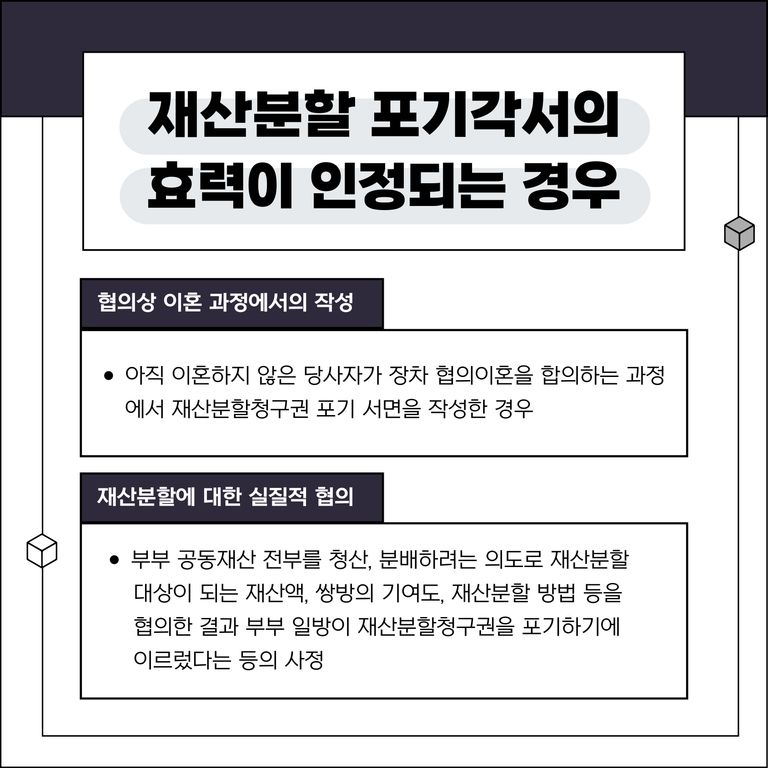 결혼생활을 하며 상대 배우자가 저지른 유책사유를 용서하는 과정에서 재산분할 포기각서를 쓰는 경우 등을 예로 들 수 있는데요.