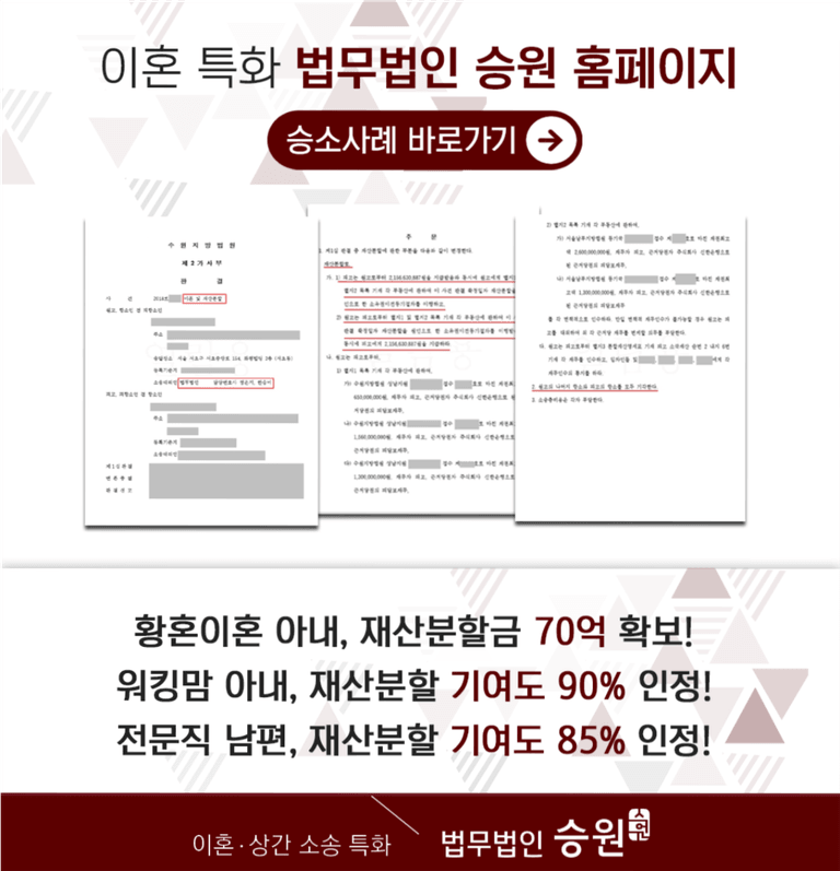 오늘은 별거이혼소송을 통해 위자료, 과거 양육비 및 장래 양육비, 재산분할기여도 등을 모두 인정받을 수 있었던 사건을 소개해 드렸습니다.
