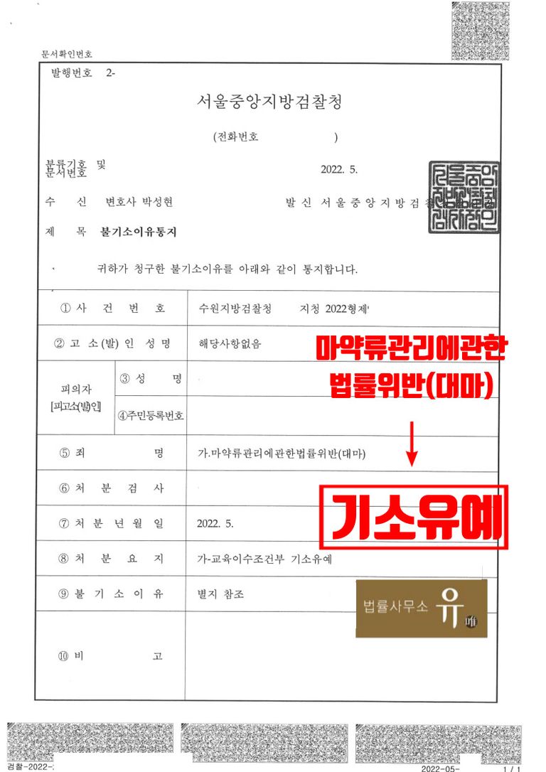 수원지방검찰청 성남지청은 법률사무소 유(唯)의 마약전문변호사가 작성하여 제출한 변호인의견서의 내용을 대폭 수용하여 대마왁스 수입에 대해서는 피의자(의뢰인)가 성분분석표를 확인하지 못하고 기준치를 초과한 대마 성분이 함유된 사실을 몰랐던 점, 현재 진지하게 반성하고 있는 점, 이 사건 이전에 동종 범죄 전력이 없는 초범인 점, 우발적 범행인 점, 단약 의지가 확고한 점 등을 참작하여 교육 이수를 조건으로 기소유예 처분을 하였습니다.