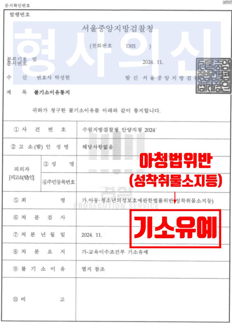 수원지방검찰청 안양지청 검사는 법률사무소 유(唯)의 형사전문변호사가 제출한 변호인의견서 및 양형자료 등을 받아들여, 의뢰인에게 동종 전력이 없고 범행을 인정하며 반성하고 있는 점, 호기심에 우발적으로 범행에 이르게 된 점, 성착취물을 구입한 횟수가 1회인 점, 범행과 관련된 성착취물을 전부 삭제하여 소지하지 않고 있는 점 등을 유리한 정상으로 보아‘불기소(교육이수조건부 기소유예)’결정을 하였습니다.