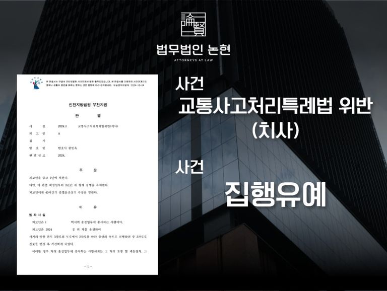 그 결과 법원에서는 본 변호인의 주장을 모두 받아들였고, 당시 의뢰인이 연루되었던 “교통사고처리특례법 위반 (치사)” 혐의에 대해 ‘집행유예’를 선고하며, 다행히도 좋은 결과를 얻을 수 있었는데요.