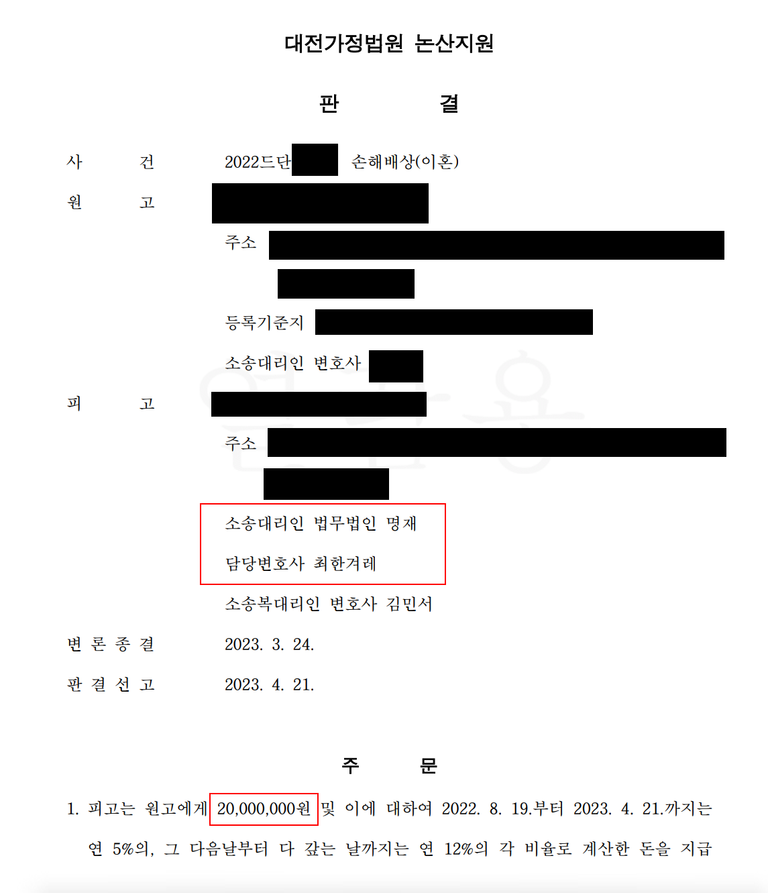 피고는 원고에게 위자료 2천만 원을 지급하라는 판결이 나옵니다.