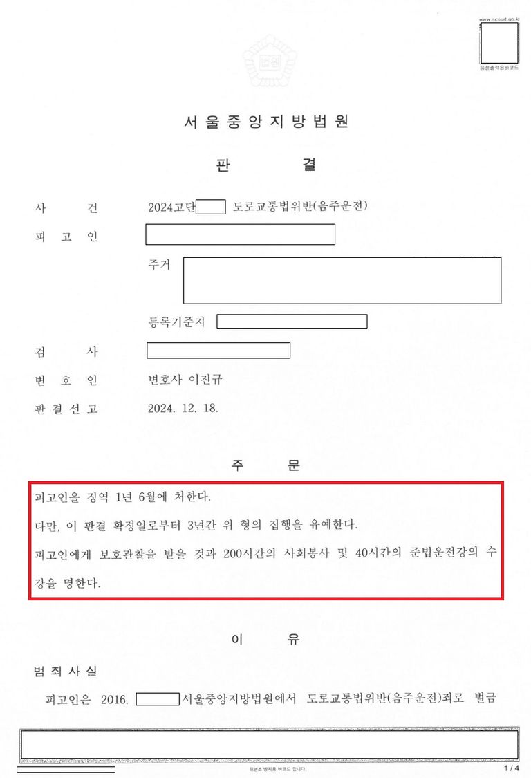 의뢰인 분께서는 과거 2006.경 / 2011.경 / 2016.경 / 2021.경 총 4회 도로교통법위반(음주운전)으로 처벌받은 전력이 있는 상황에서 또 다시 음주운전을 하였고, 특히 2021.경에는 집행유예 선고를 받으신 상황이었기 때문에 실형이 선고될 가능성이 큰 사건이었으나, 변론 활동을 통해 집행유예의 선처를 받은 사건입니다.