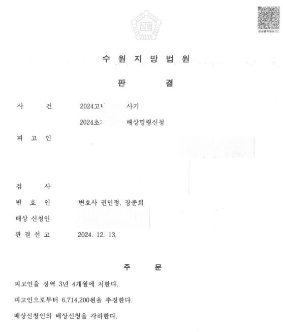 그 결과 1심에서 14명의 피해자들 중 5명과 합의를 마쳤고 피해액의 5% 미만의 금액으로 합의를 이끌어냈습니다. 선임 이후 1심에서 모든 합의가 이루어졌기 때문에 검찰 역시 공범들의 구형(9년)보다 낮은 형(8년)을 구형했으며 선고형 역시 가장 낮은 형이 선고되었습니다.