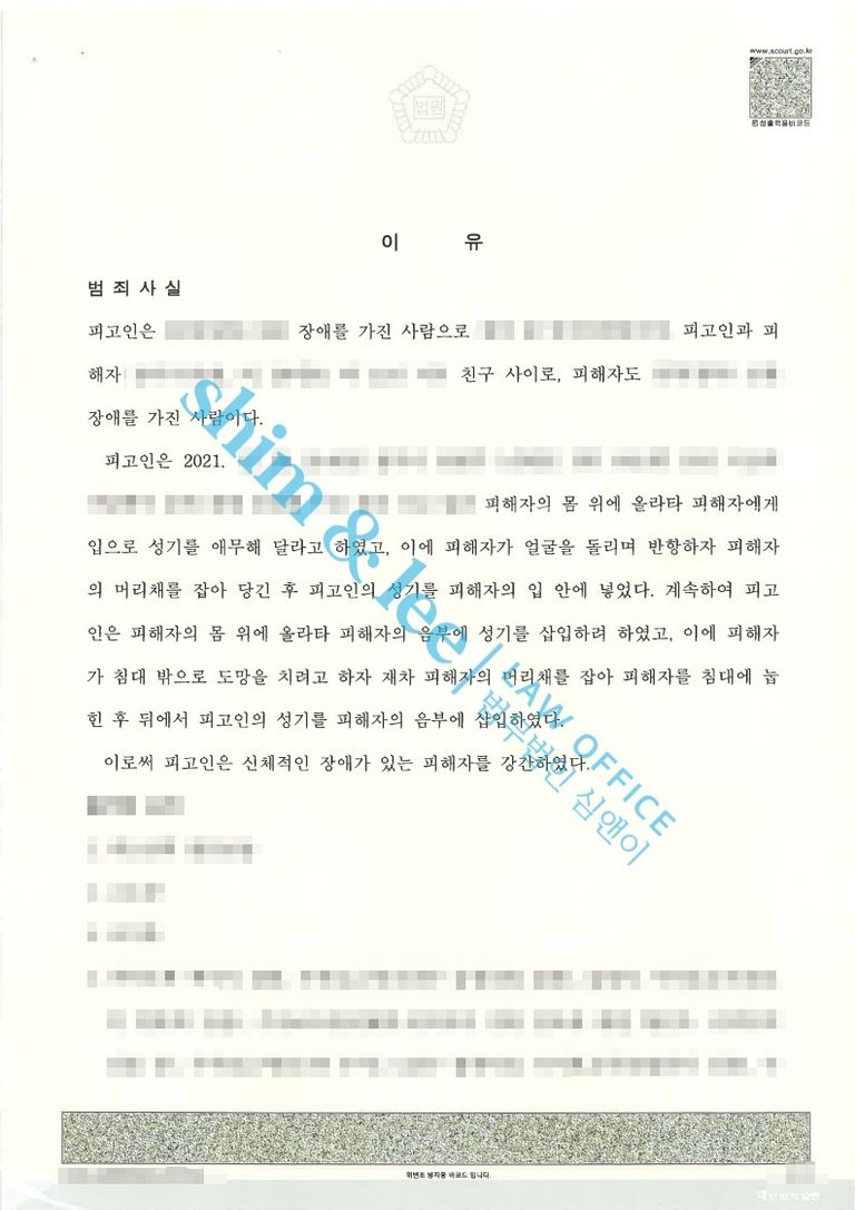 -또한, 의뢰인의 의사에 반하여 강제로 간음을 하였다는 점이 인정되어 징역 2년, 집행유예 3년, 아동, 청소년 관련기관과 장애인 관련기관 취업제한 3년의 선고가 내려졌습니다.