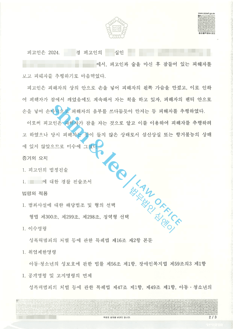 - 의뢰인은 주량을 넘겨 술에 취해 정신을 잃게 되었습니다. 그런데 누군가 자신의 가슴을 만지는 느낌에 눈을 뜨게 되었고, 컴컴한 방 안에서 자신을 만지고 있는 사람이 스승이자 상사인 가해자라는 사실을 알게 되었습니다. 의뢰인은 너무 놀라고 두려워 몸을 뒤척여 봤지만 가해자는 멈추지 않고 의뢰인의 맨 가슴을 만지다 손을 내려 성기까지 더듬었습니다.