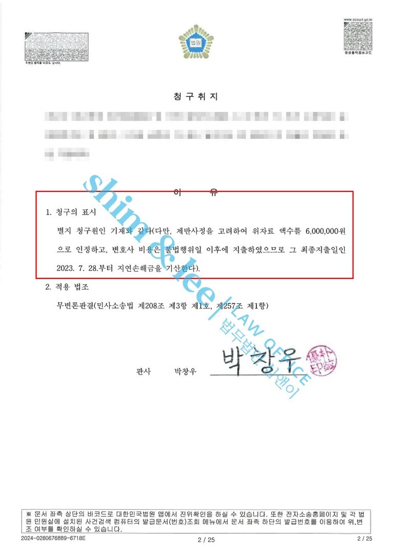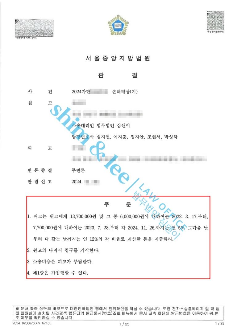 - 담당 변호사님은 즉시 피고에게 연락하여 판결금을 지급해야 할 의무가 있다고 통보하였고, 의뢰인께서 별도 집행 절차 없이 빠르게 지급받으실 수 있도록 마지막까지 조력했습니다.