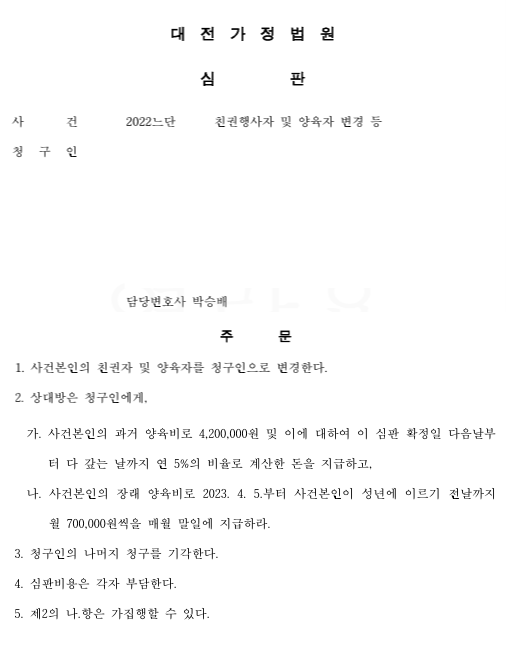 다행히 앞으로 양육비 관련해서 문제가 생길 것을 염려한 의뢰인은 법률사무소를 방문하여 친권자 및 양육권자 변경 청구가 필요함을 알게 되었고 변호사의 조력을 받아 가정법원으로부터 자의 친권자 및 양육권자 변경과 더불어 심판청구일 이후의 과거 양육비까지 받아낼 수 있었습니다.