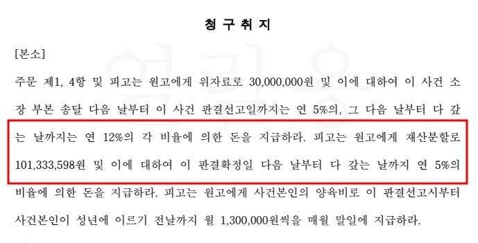 *상대방이 청구한 101,333,598원. 기각 되어 10%만 재산분할 함.