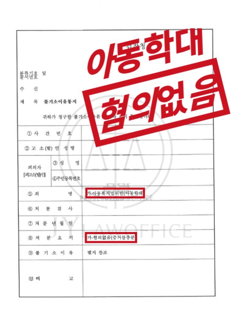 본 사건의 의뢰인은 상대 아동에게 정서적 학대 행위를 했다는 오인을 받아 '아동복지법위반'혐의를 받게 되었습니다. 이에 의뢰인은 본 JY법률사무소를 찾아 사건을 정식 의뢰해 주셨습니다.
