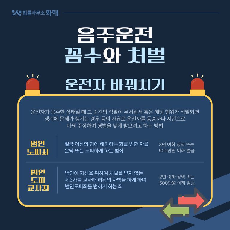 음주 운전자가 사고를 내고 처벌을 피하기 위해 운전자를 동승자나 지인으로 바꿔 신고하는 '운전자 바꿔치기' 꼼수도 많이 발생합니다. 이는 보통 운전자가 음주한 상태일 때 그 순간의 적발이 무서워서 혹은 해당 행위가 적발되면 생계에 문제가 생기는 경우 등의 사유로 다른 사람을 운전자라고 주장하여 형벌을 낮게 받으려고 하는 꼼수 방법인데요. 의외로 많은 사람들이 이러한 행위를 안일하게 생각하는 경우가 많습니다.