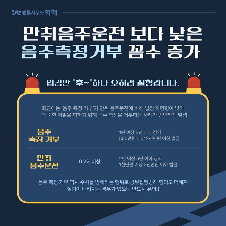 최근에는 ‘음주 측정 거부’가 만취 운전에 비해 법정 하한형이 낮아 본인이 만취 운전이라고 판단되거나 처벌을 피하기 위해 음주 측정을 거부하는 사례가 빈번하게 발생하면서 운전자들의 새로운 꼼수로 떠오르고 있는데요.