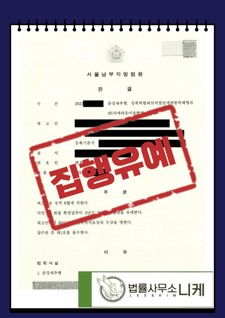 그 결과 의뢰인은 준강제추행 및 성폭력범죄의처벌등에관한특례법위반(카메라등이용촬영,반포등) 혐의를 받고 법정형으로 최소 벌금형 최대 징역형을 선고받을 수 있었음에도 불구하고 집행유예 처분으로 끝날 수 있었습니다.