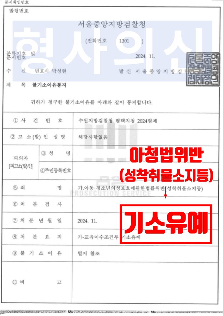 수원지방검찰청 평택지청 검사는 법률사무소 유(唯)의 형사전문변호사가 제출한 변호인의견서 및 양형자료 등을 받아들여, 의뢰인에게 동종 전력이 없고 범행을 인정하며 반성하고 있는 점, 우연히 성명불상자로부터 성착취물 영상을 받은 것으로, 소지하지 않았던 점 등을 유리한 정상으로 보아‘불기소(교육이수조건부 기소유예)’결정을 하였습니다.