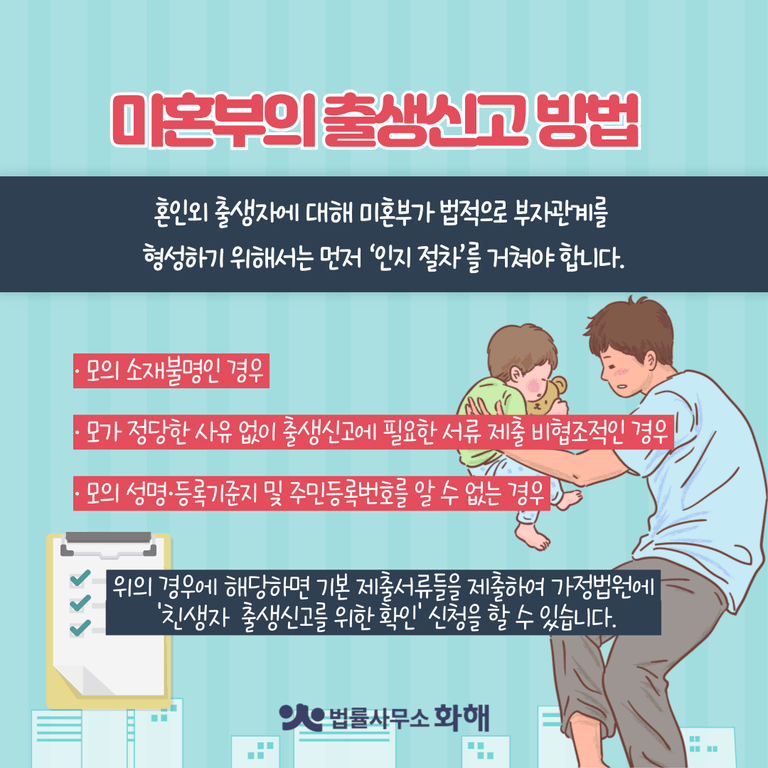 가족관계 등록법에 따르면 혼인 외 출생자의 출생신고는 모가 하여야 한다고 나와 있습니다. 그리고 이러한 현실은 많은 미혼부들에게 큰 고통이 되고 있는데요. 오늘은 미혼부들의 어려움과 그들이 할 수 있는 법적 조치에 대해 자세히 알아보고자 합니다.