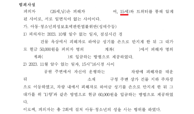 A씨는 트위터를 하던 중 B양이 15세 미성년자라고 밝히며 조건만남을 한다는 광고를 보고 B양에게 연락하여 조건만남을 하기로 하고, 2023. 10.경과 11.경 B양으로 하여금 자위행위를 하게 하고 그 대가로 5만 원, 6만 원을 이체하게 하여 총 2회에 걸쳐 아청 성매수를 하였습니다.