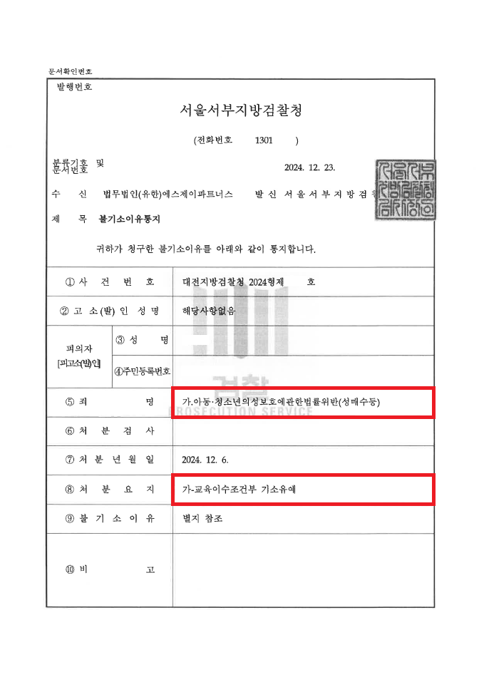 이러한 저의 조력을 바탕으로 A씨는 미성년자에게 성매매를 권유하기만 해도 구공판될 정도로 아청법상(성매수) 사건에 대해 대해 강하게 처벌하고 있어 '기소유예' 처분이 거의 불가능함에도 불구하고 이례적으로 '기소유예' 처분을 받음으로써 성범죄 전과자가 될 위기에서 벗어날 수 있었습니다.