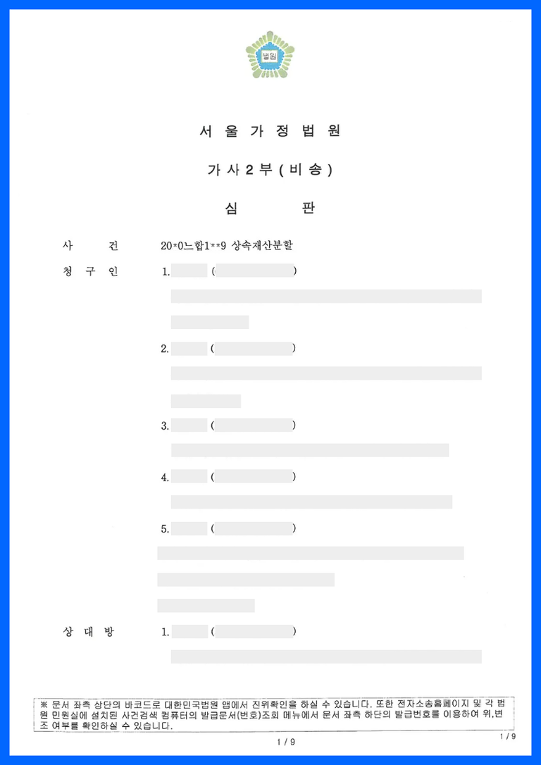 한편 청구인들은 먼저 사망한 장남의 상속인들인 상대방들을 상대로 장남 명의의 예금과 부동산이 상속재산이라고 주장하면서 가정법원에 상속재산분할심판을 제기하였습니다.