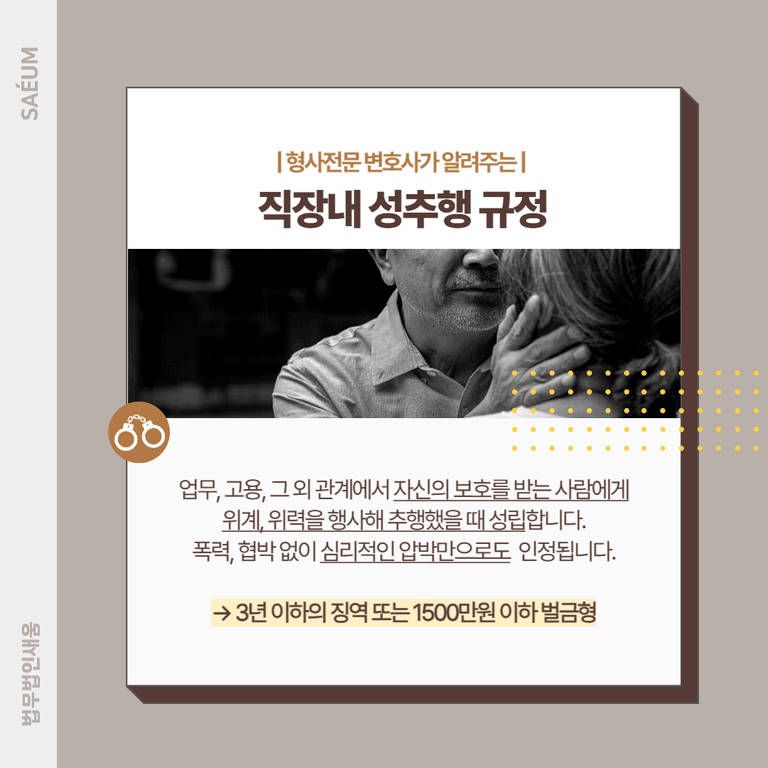 직장 내에서 발생하는 성추행의 경우 형법이 아닌 성폭력 범죄의 처벌 등에 관한 특례법이 적용될 수 있는데요. 구체적으로 업무상위력등에의한추행죄를 뜻합니다. 업무, 고용 혹은 그 외의 관계로 인해 자신의 보호를 받는 사람에 대해 위계 또는 위력을 행사하여 추행하였을 때 성립합니다. 이때 가해자는 3년 이하의 징역 또는 1,500만 원 이하의 벌금형까지 처하게 됩니다.