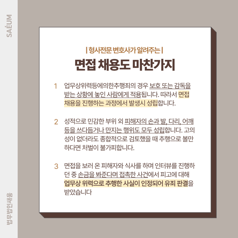 한편 업무상위력등에의한추행죄의 경우 앞서 언급한 대로 사실상 보호 또는 감독을 받는 상황에 놓인 사람에게 적용된다는 점에서, 직장내 성추행을 포함해서 면접 채용을 진행하는 과정에 발생할 때도 성립이 됩니다.